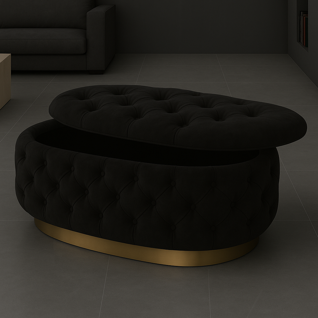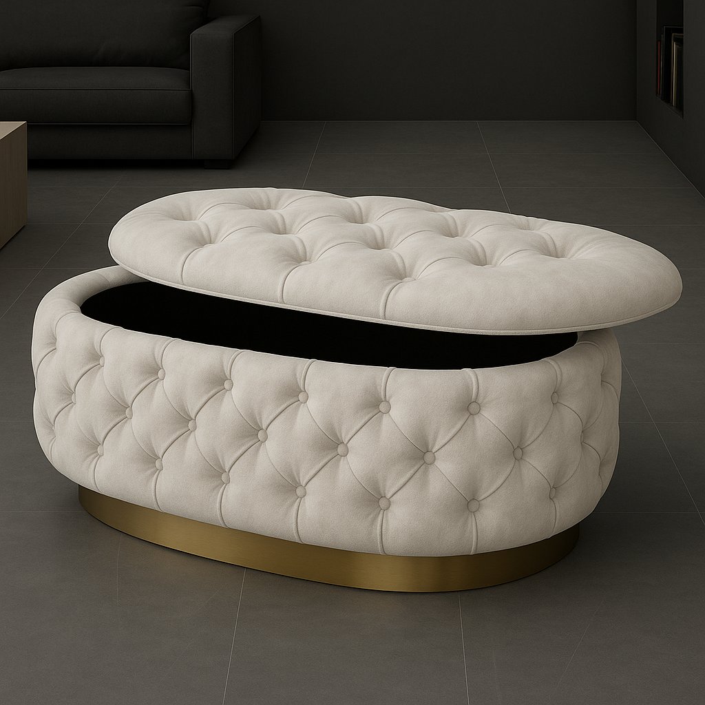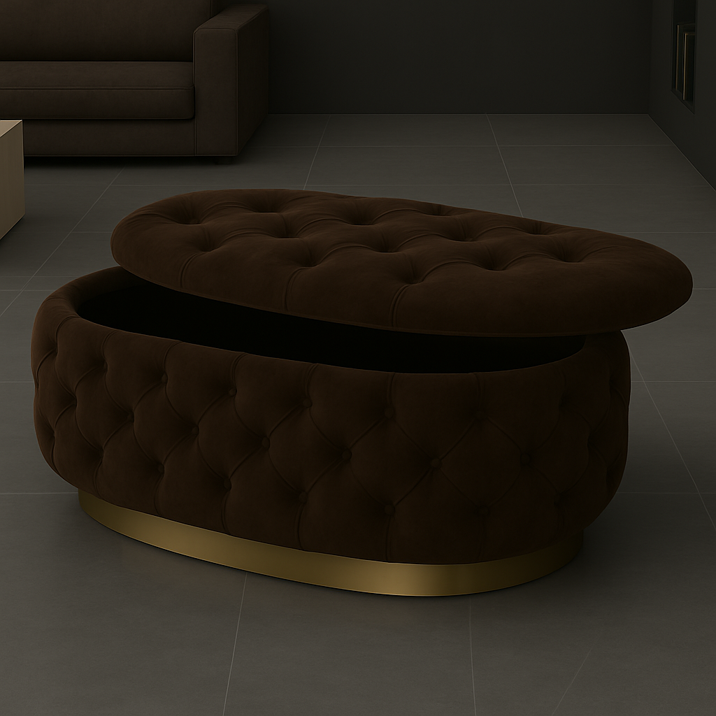 Experience luxury and functionality with the Handmade Opulent Oval Shaped Fully Upholstered Storage Ottoman Box.