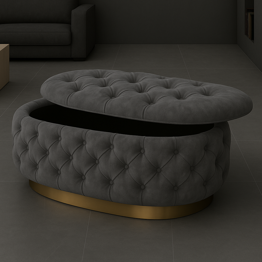 The Opulent Oval Shaped Ottoman Box combines elegance with storage convenience. The main picture showcases the ottoman in Grey Plush Fabric, radiating sophistication and charm.