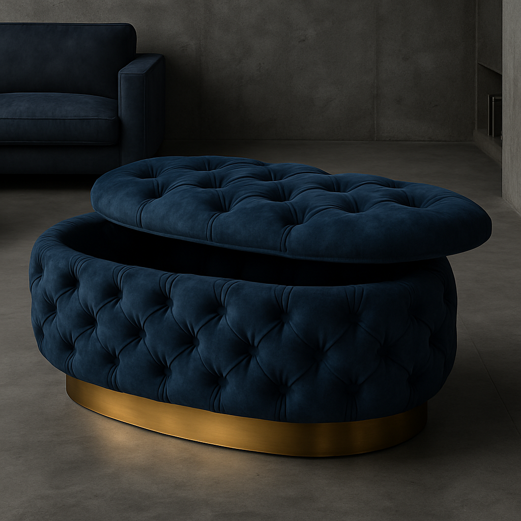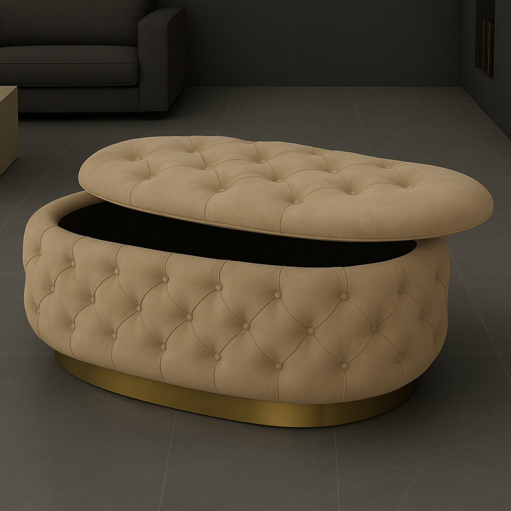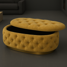 Transform your living space with the Handmade Opulent Oval Shaped Fully Upholstered Storage Ottoman Box. Elevate both the aesthetics and storage capabilities of your room.