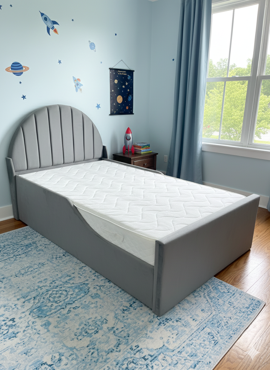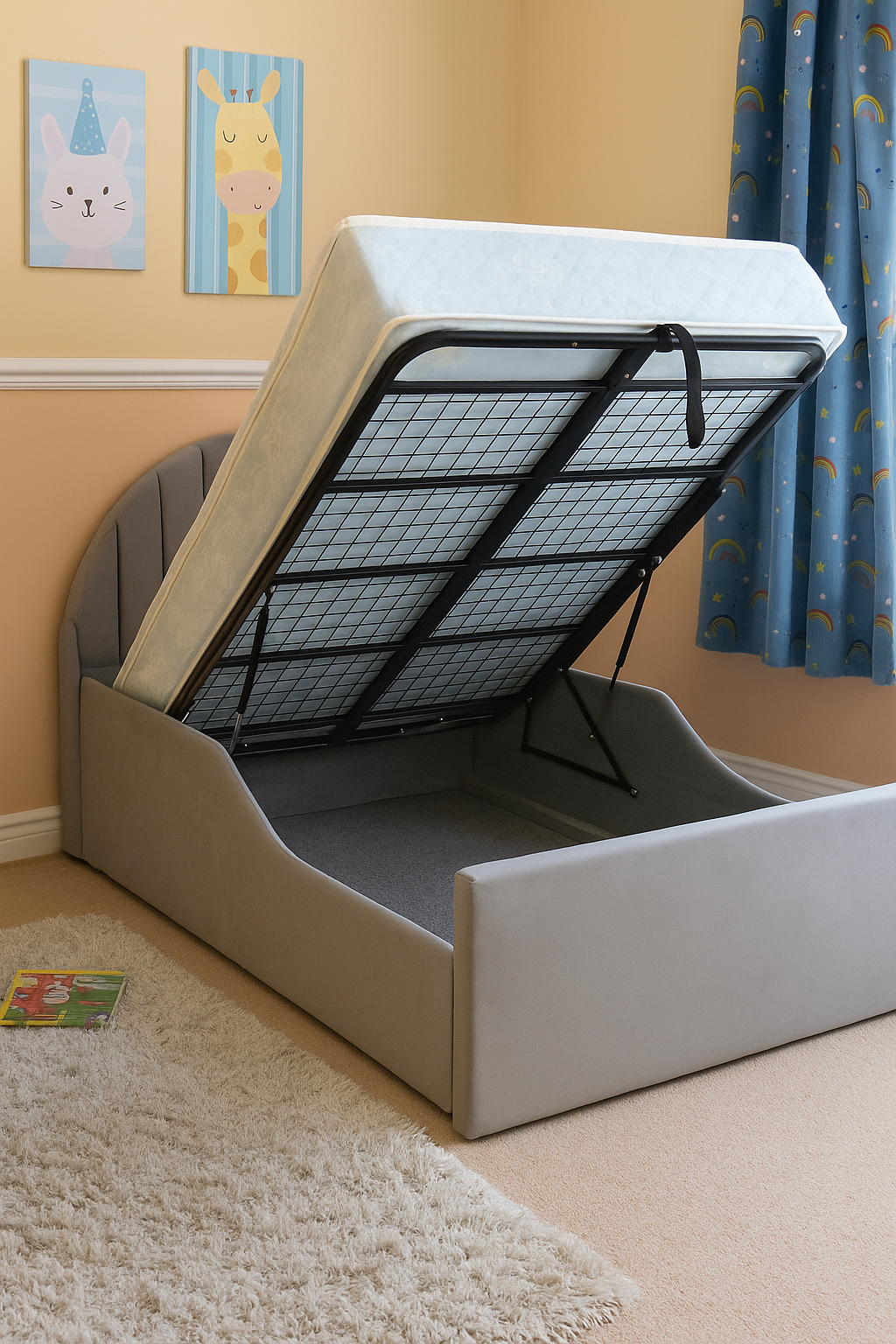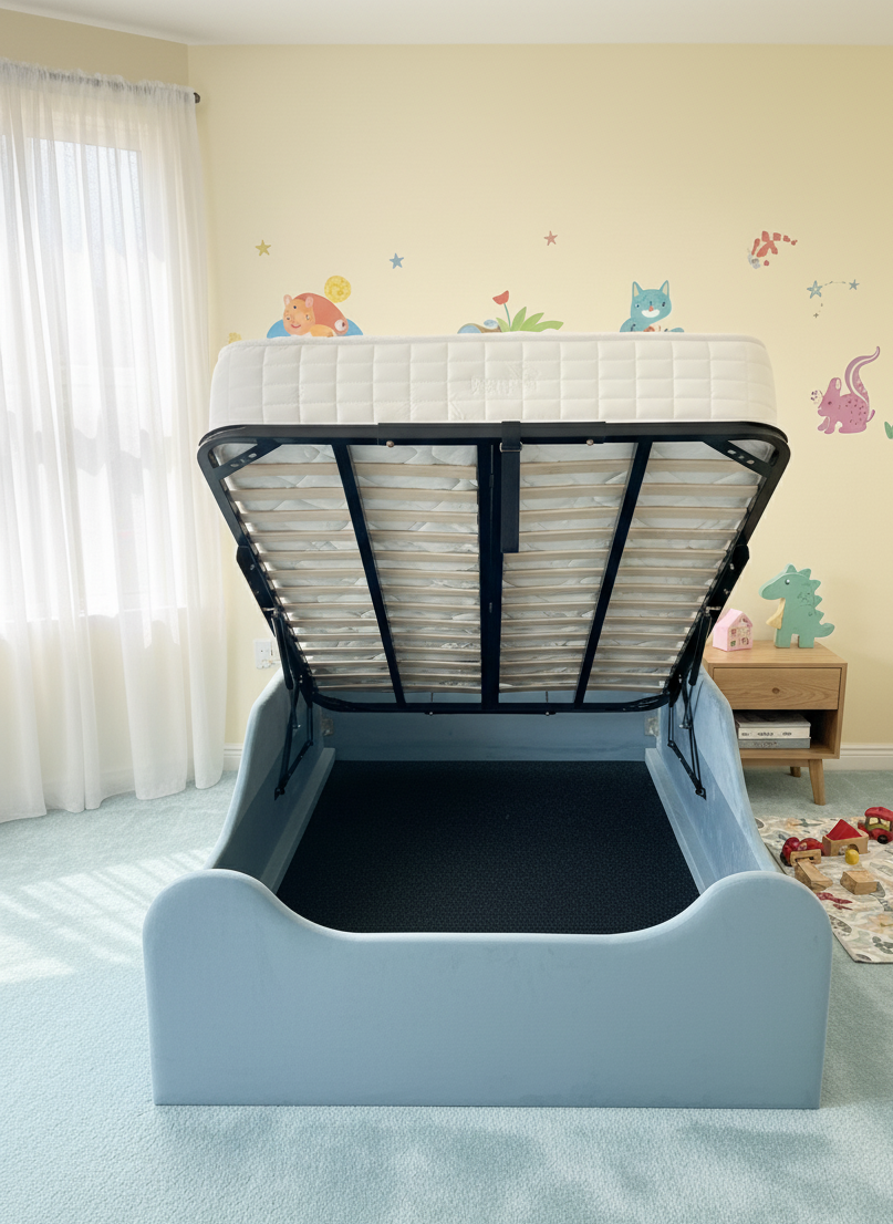 Kids Bullnose Corner Plush Velvet Bed Frame Upholstered Bed with Ottoman Storage
