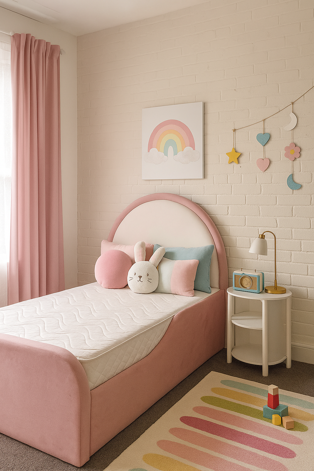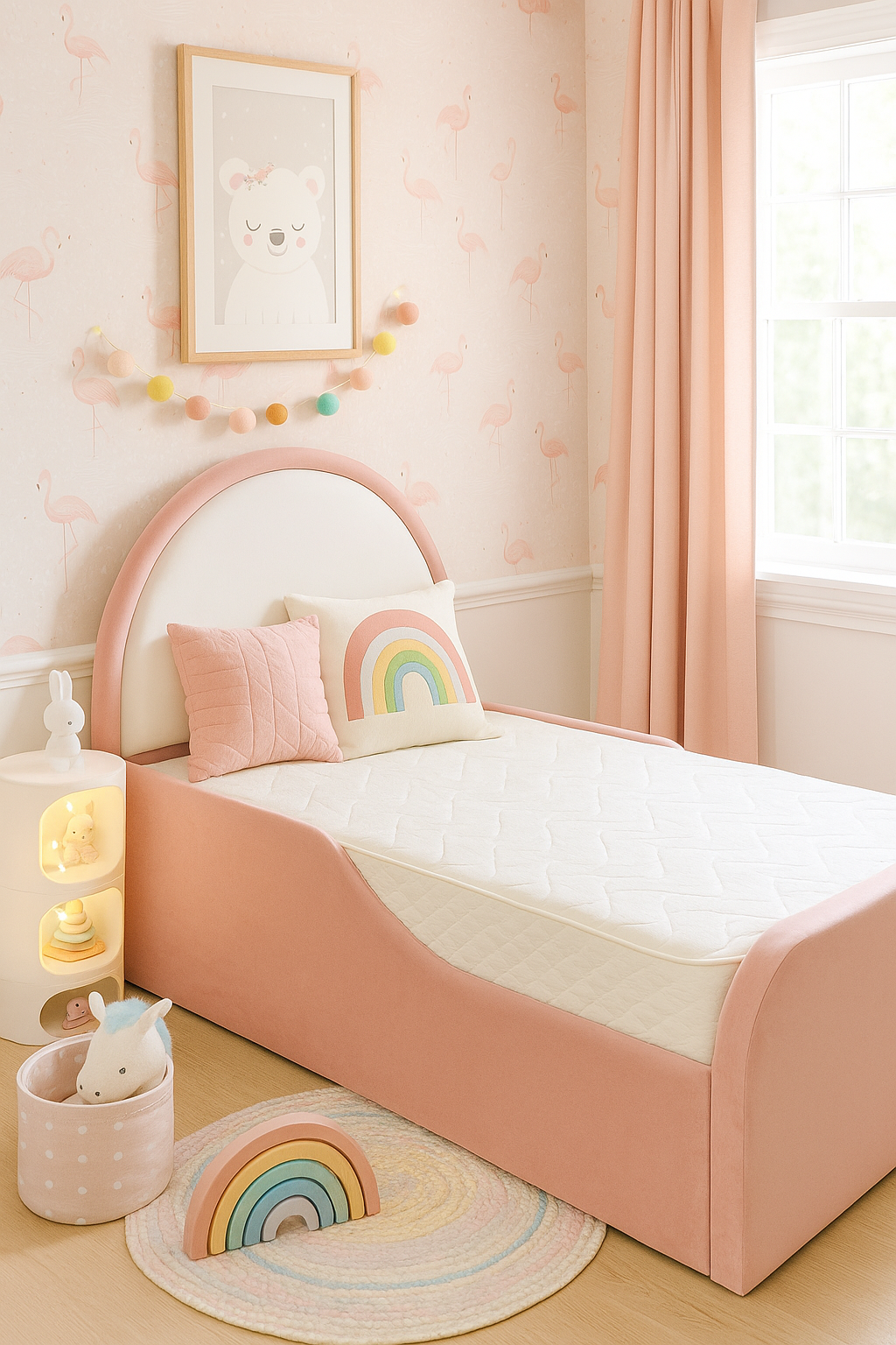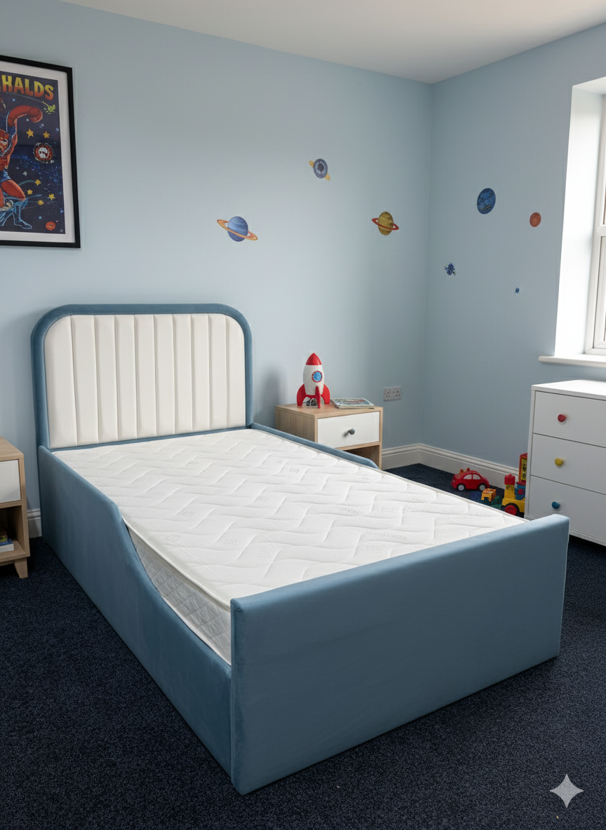 Kids Bullnose Corner Plush Velvet Bed Frame Upholstered Bed with Ottoman Storage