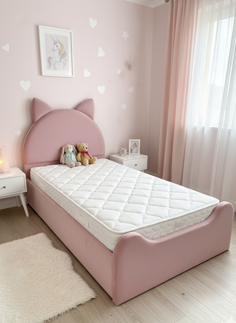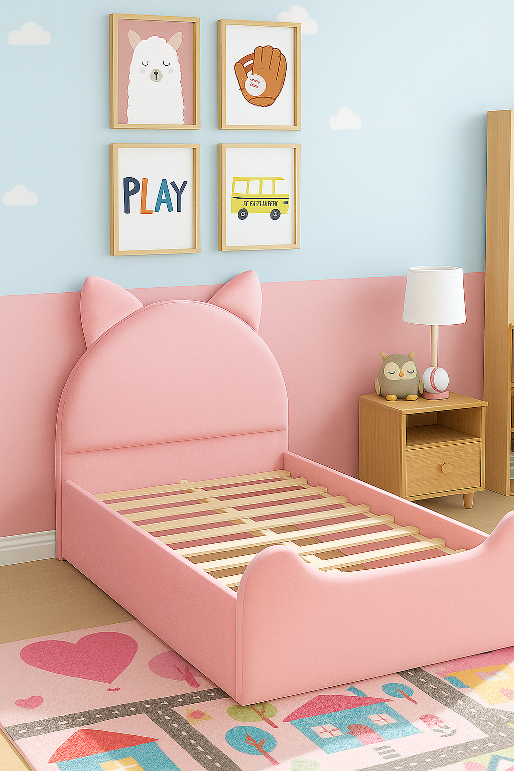 Kids Hello Kitty Style Plush Velvet Bed Frame Upholstered Bed with Ottoman Storage