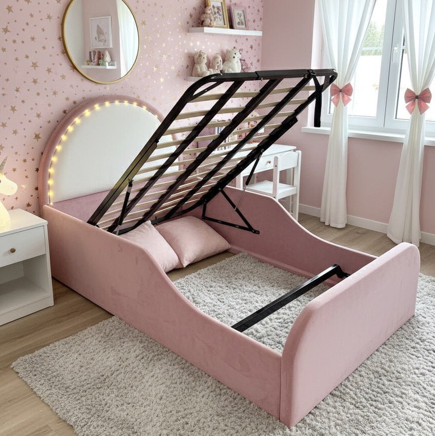 Make bedtime extra special with this Kids Bull Nose Corner Plush Velvet Bed Frame with Ottoman Storage – the perfect blend of comfort, style, and practicality for your child’s dream room.
