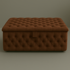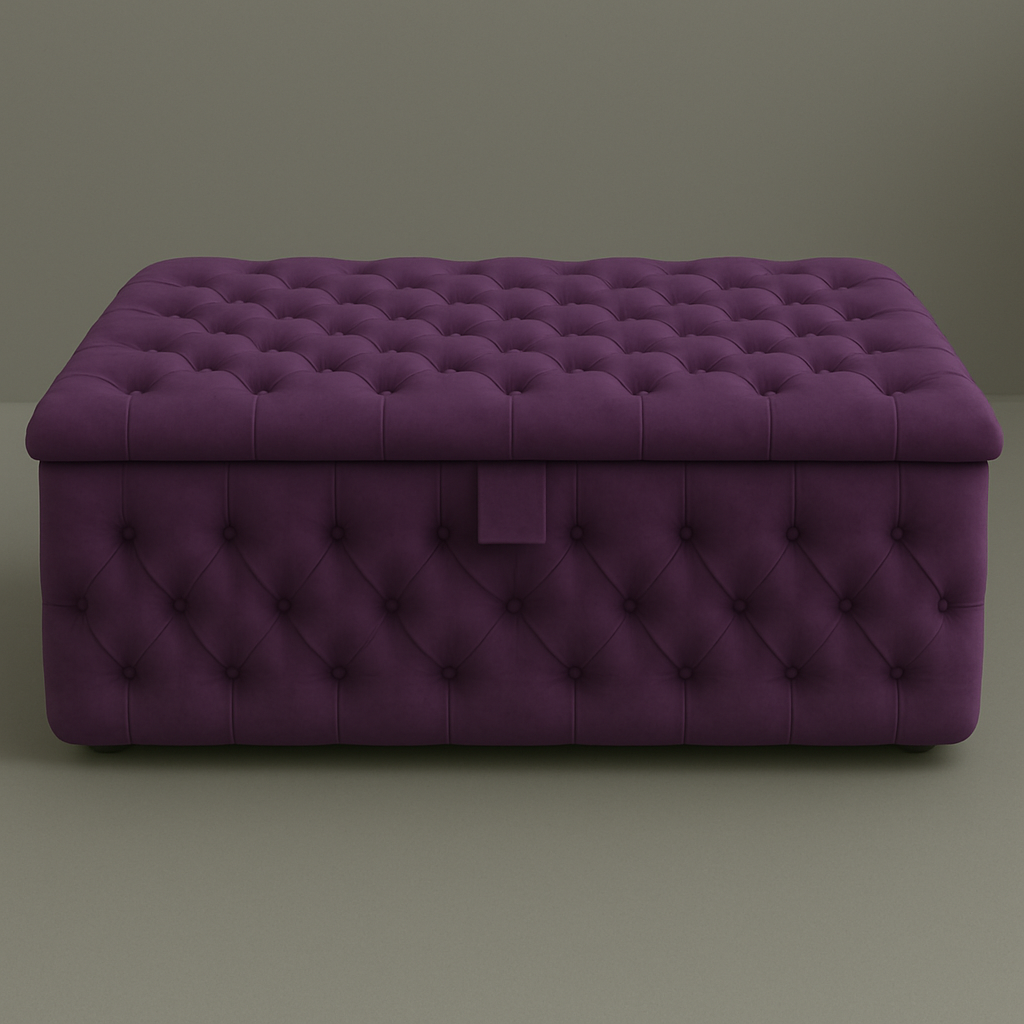 The Whisper Ottoman Box seamlessly combines the iconic Chesterfield design with functional storage. The main picture features the ottoman in Maroon Plush Fabric, emanating a sense of opulence.