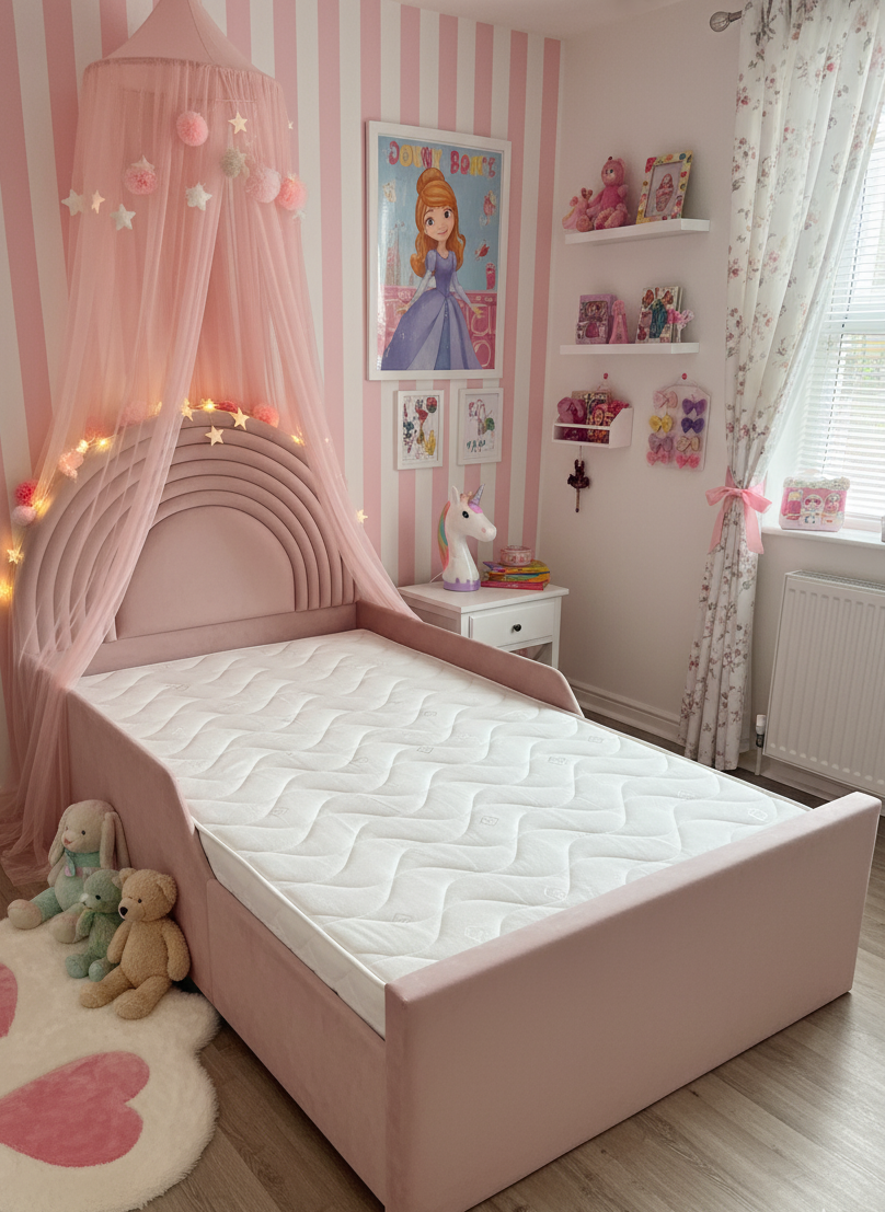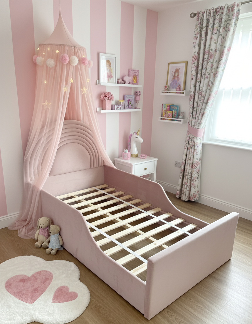 Kids Amelia Dreams Plush Velvet Bed Frame, Upholstered Bed with wooden Slats or Ottoman Storage
