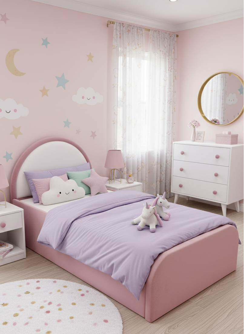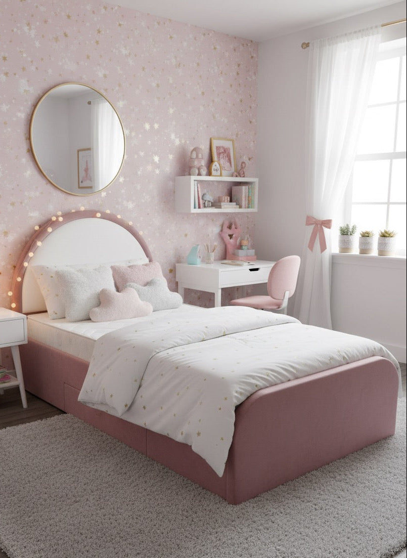 Make bedtime extra special with this Kids Bull Nose Corner Plush Velvet Bed Frame with Ottoman Storage – the perfect blend of comfort, style, and practicality for your child’s dream room.